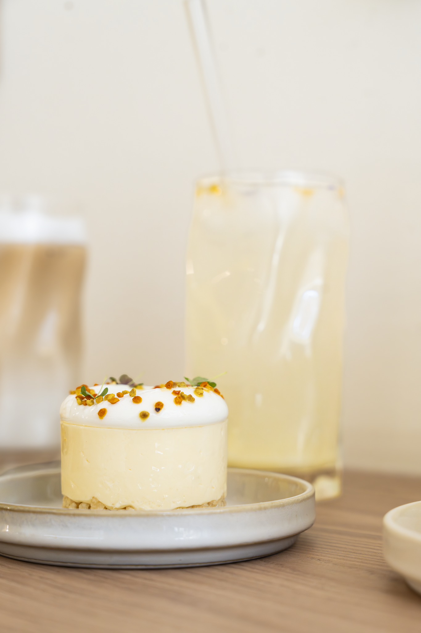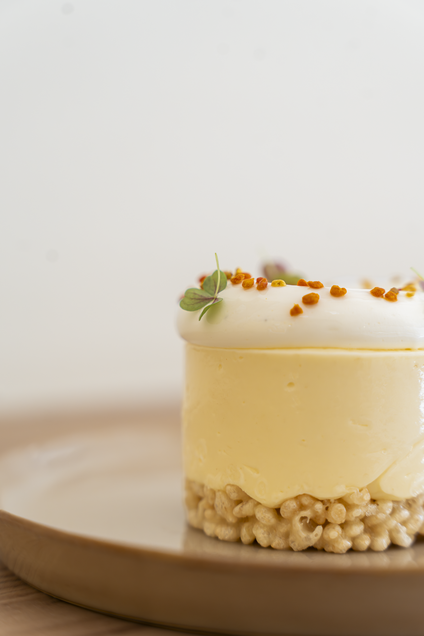 Croustillant riz soufflé, crémeux miel, mousse yaourt grec, Crème de yaourt grec et pollen de garrigues.