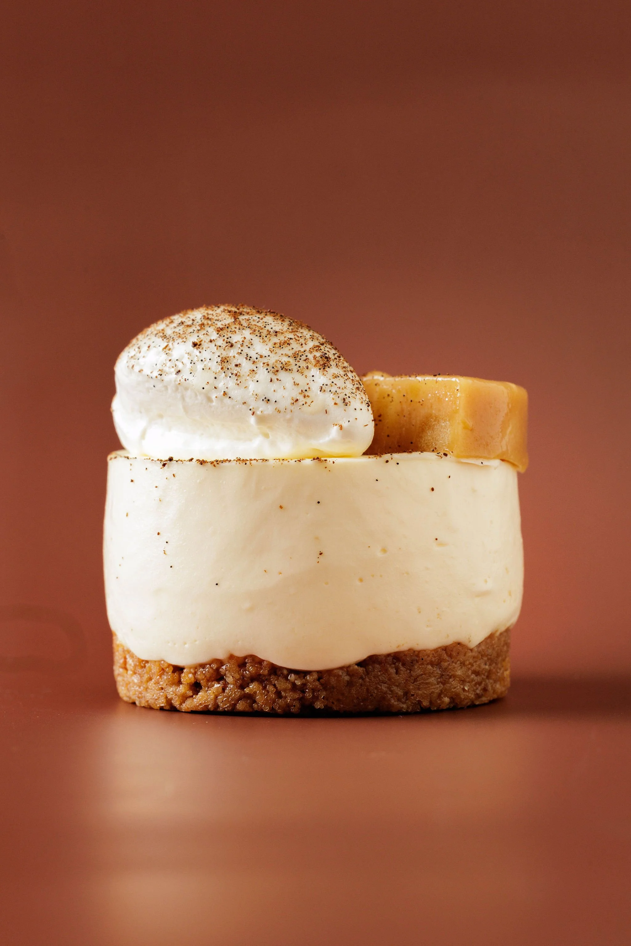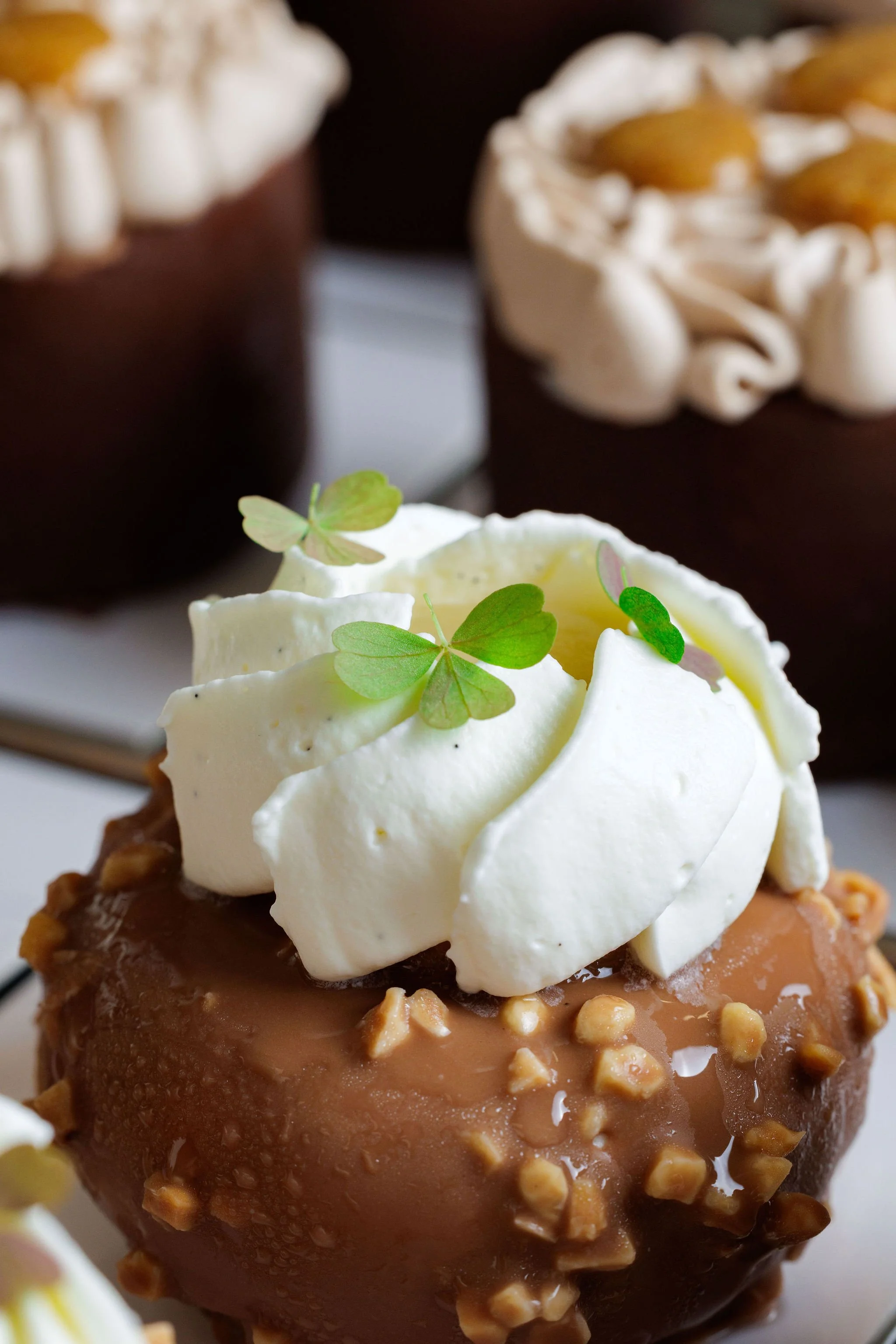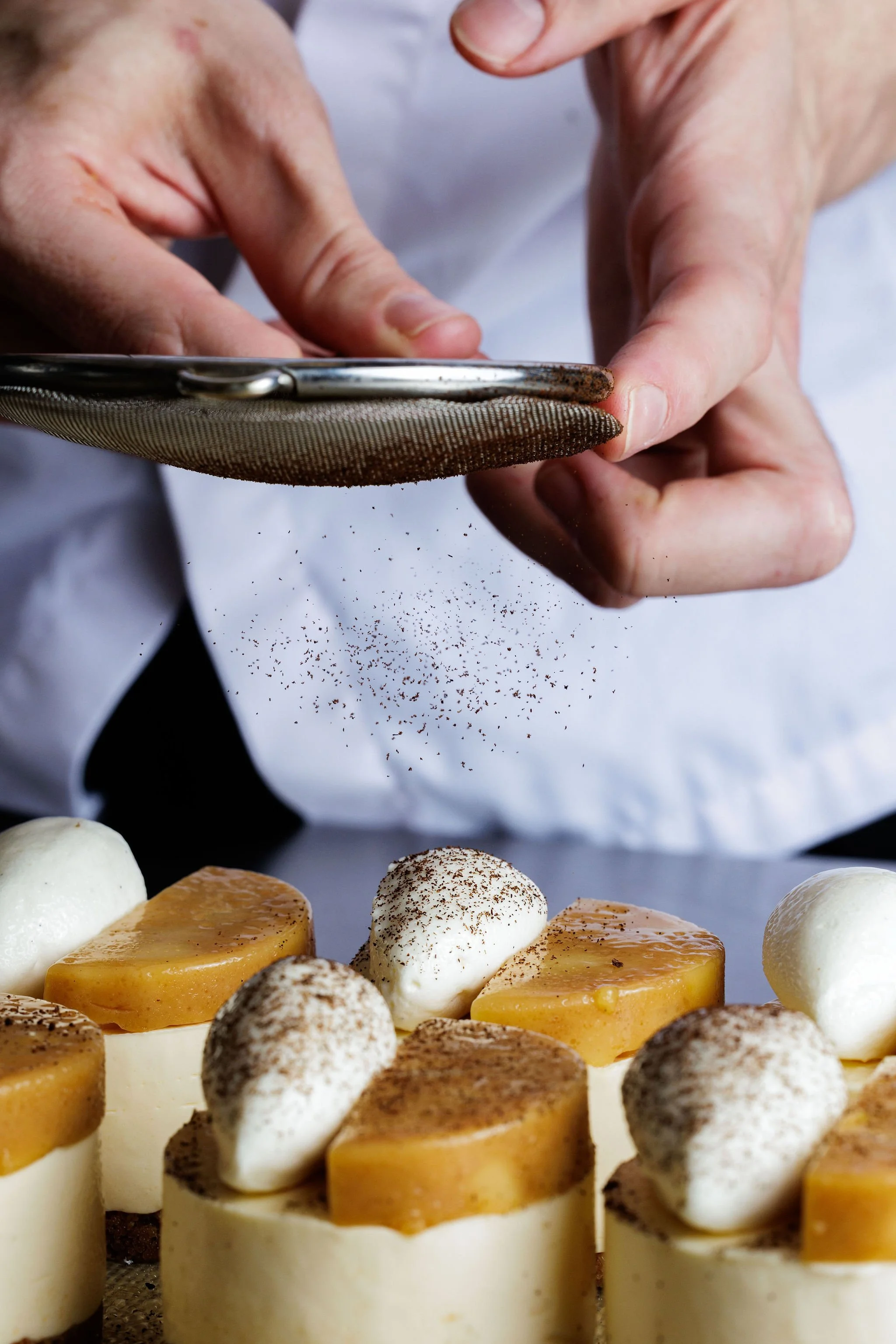 SABLé reconstitué au sarrasin, mousse au mascarpone, pommes chantecler caramélisées, ganache montée vanille de Madagascar, poudre de vanille.