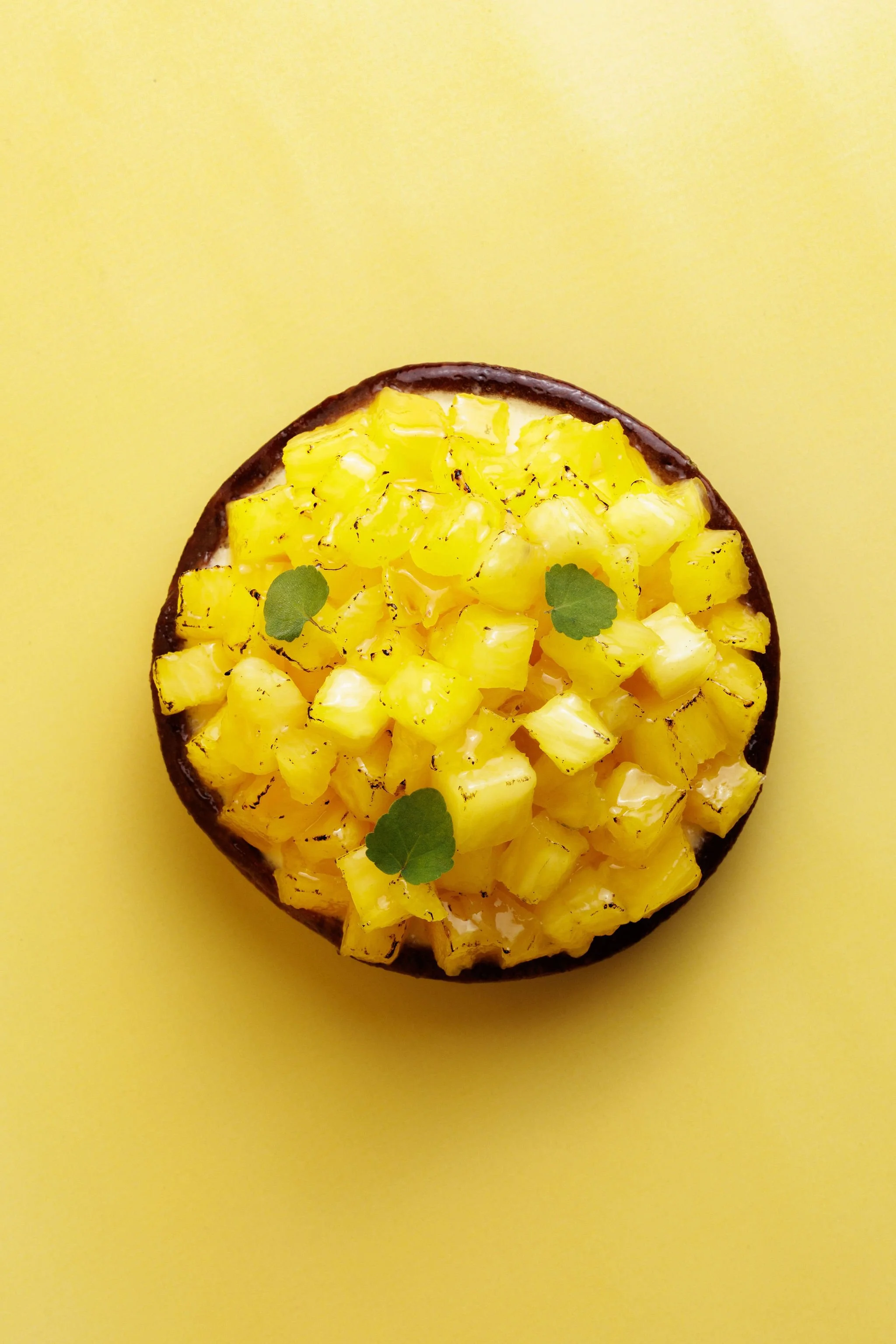 pâte sucrée amande, crème d’amande, gel citron combats, mousse vanille de Madagascar combava, brunoise d’ananas frais