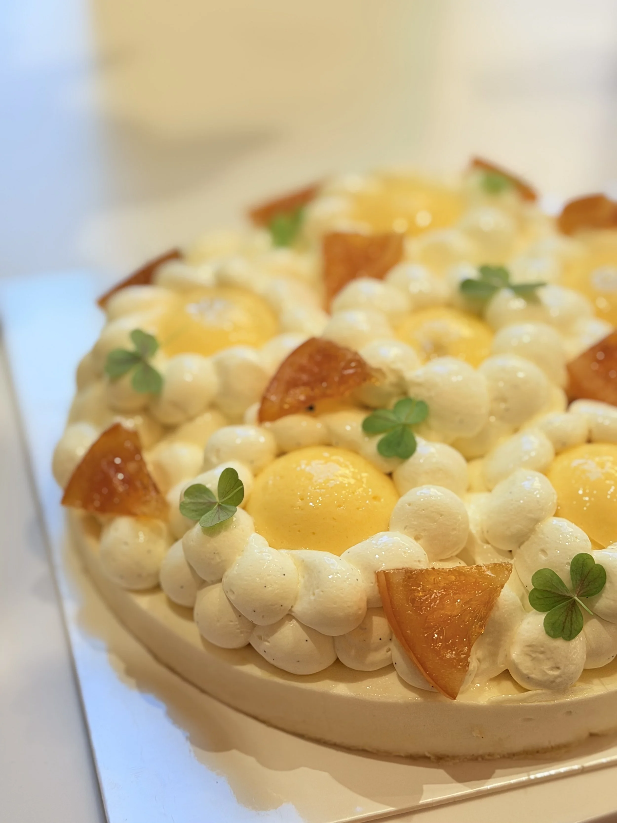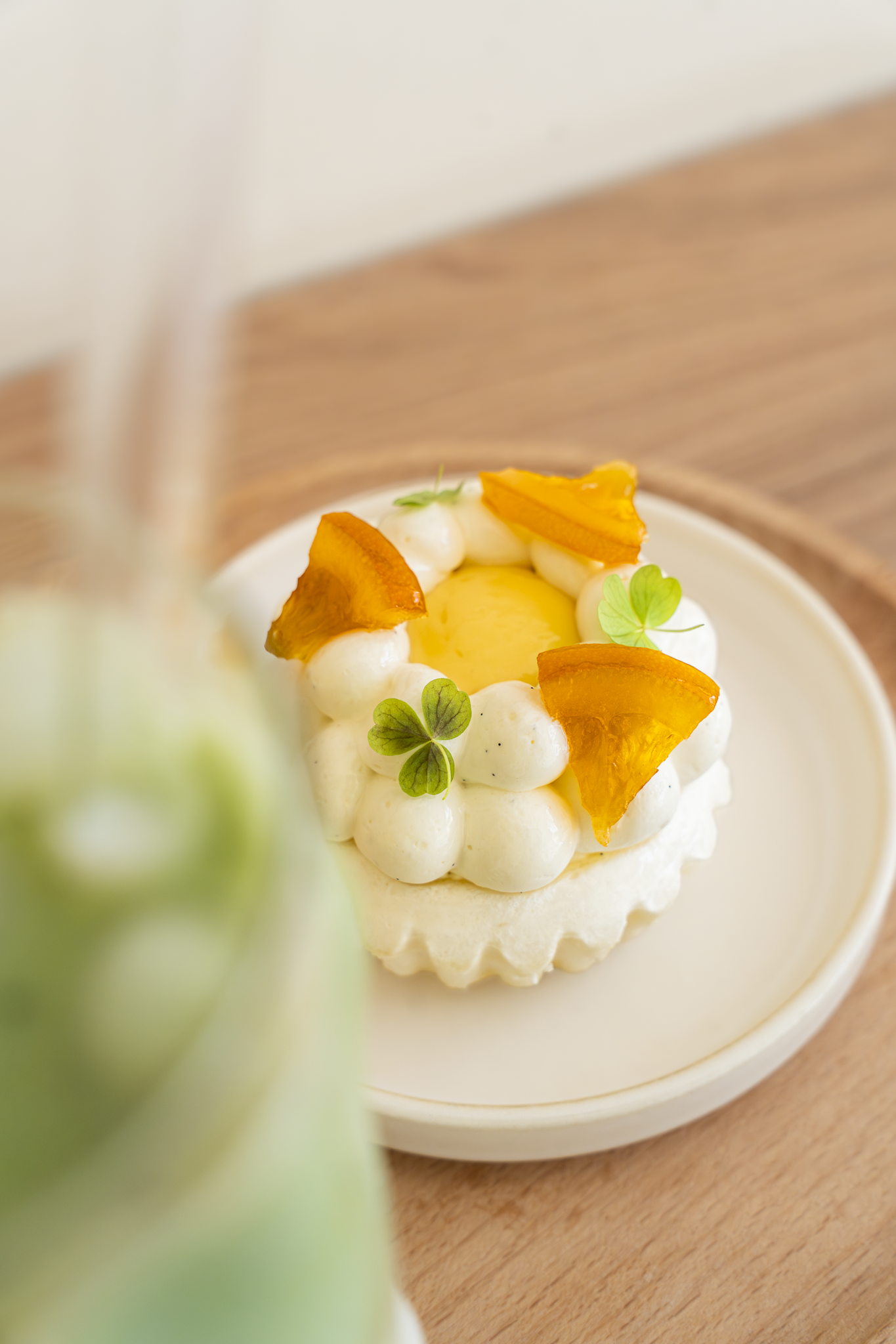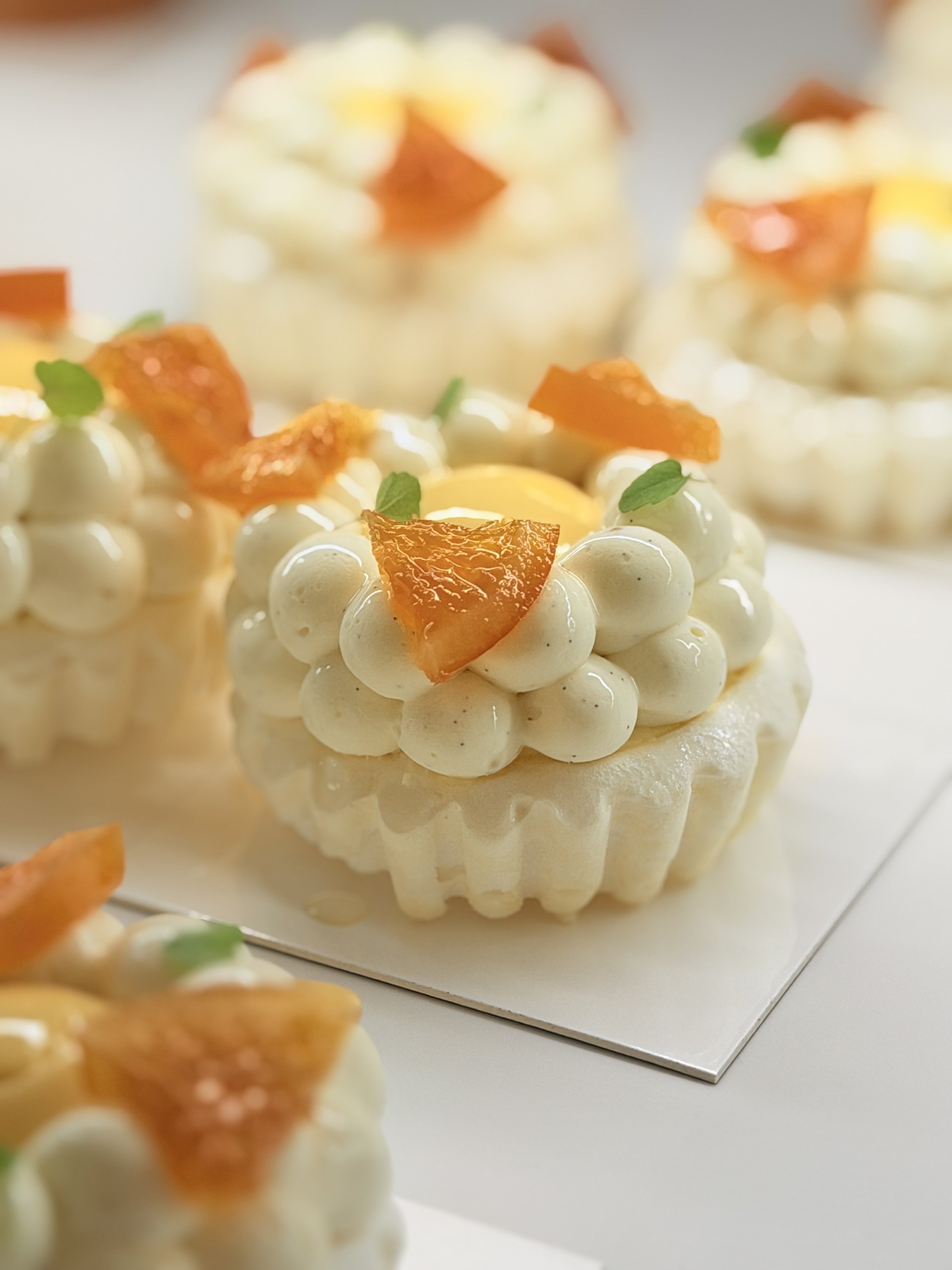 Meringue croustillante, mousse vanille, orange confites, crémeux kalamansi, gel kalamansi, ganache montée vanille de Madagascar