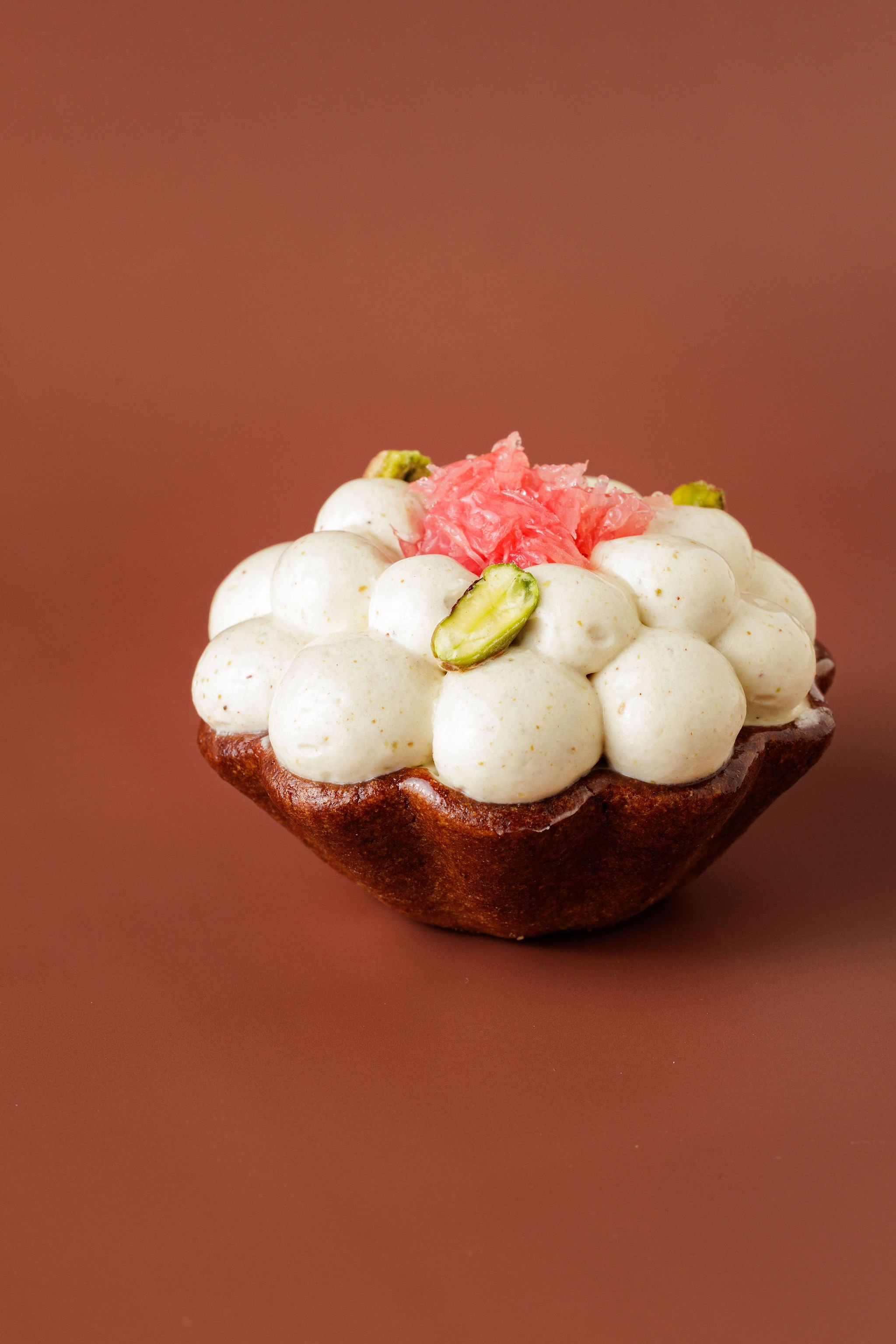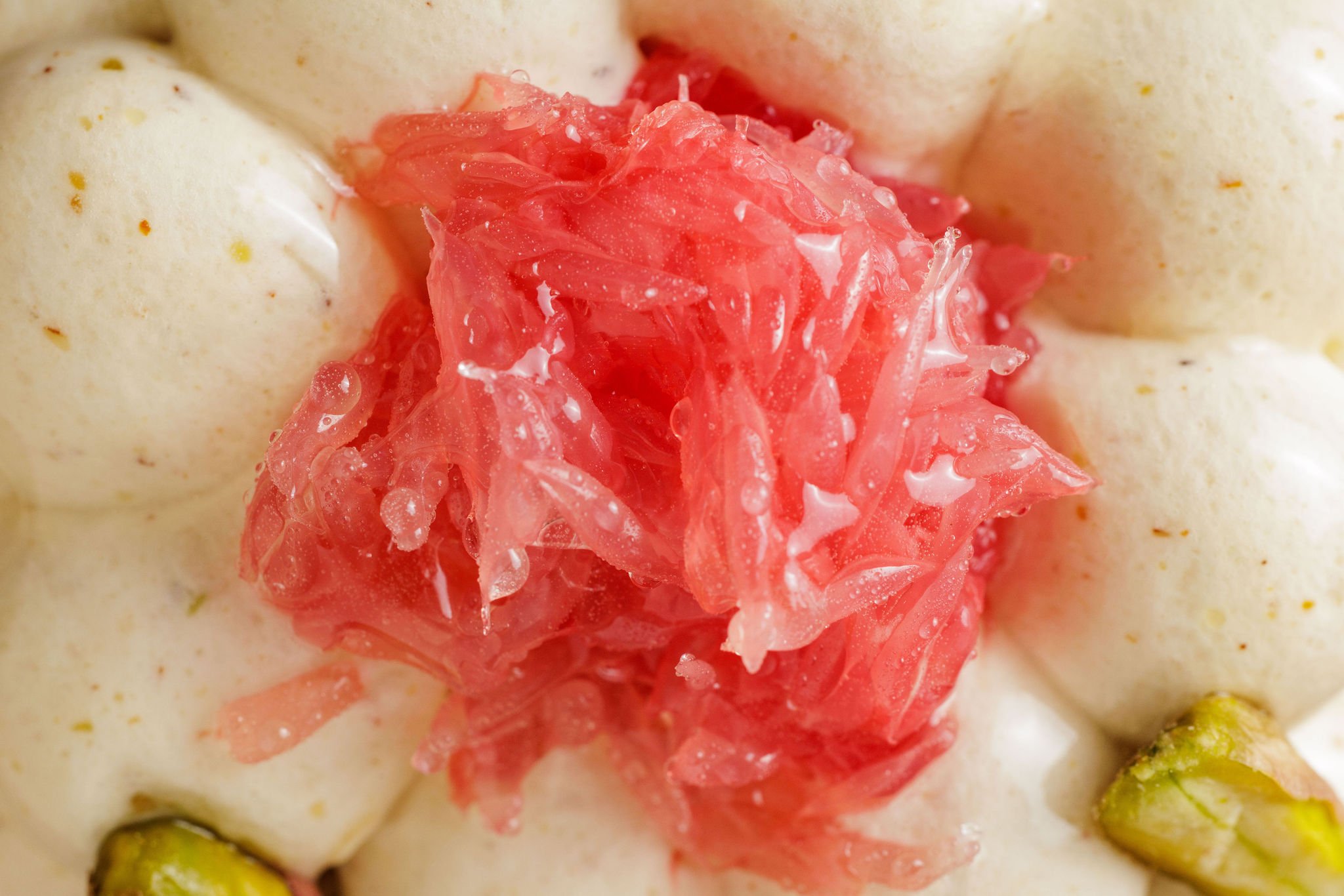 Pâte sucrée, crème d’amande, mousse pamplemousse, praliné pistache, gel pamplemousse, ganache montée pistache, caviar de pamplemousse.