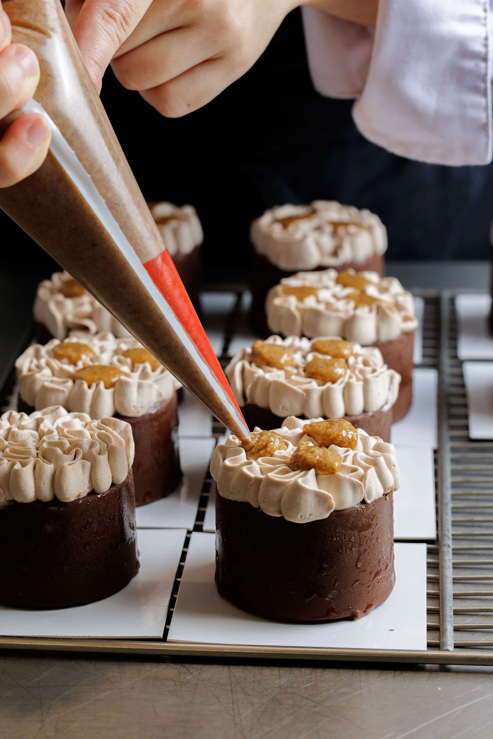 Biscuit amande noisette, croustillant maïs, crémeux chocolat, mousse chocolat, praliné maïs, ganache montée chocolat