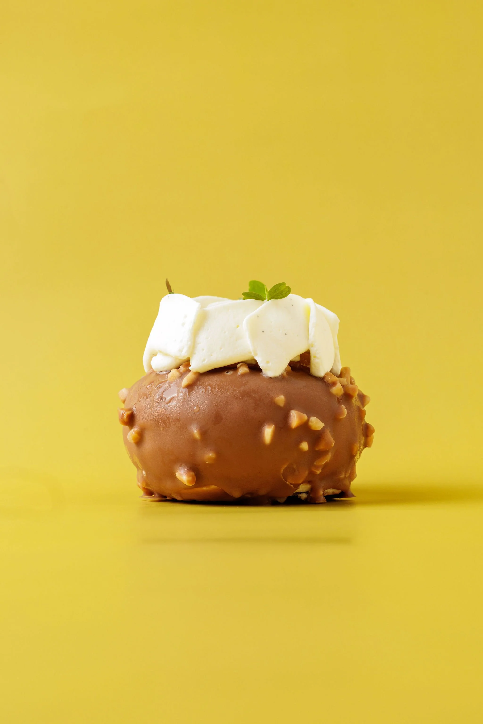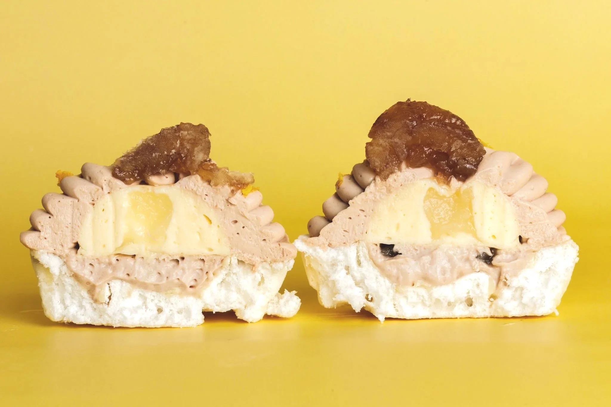 Meringue croustillante, mousse marrons, éclats de marrons glacés, crémeux yuzu, gel yuzu, ganache montée marrons, marron glacé