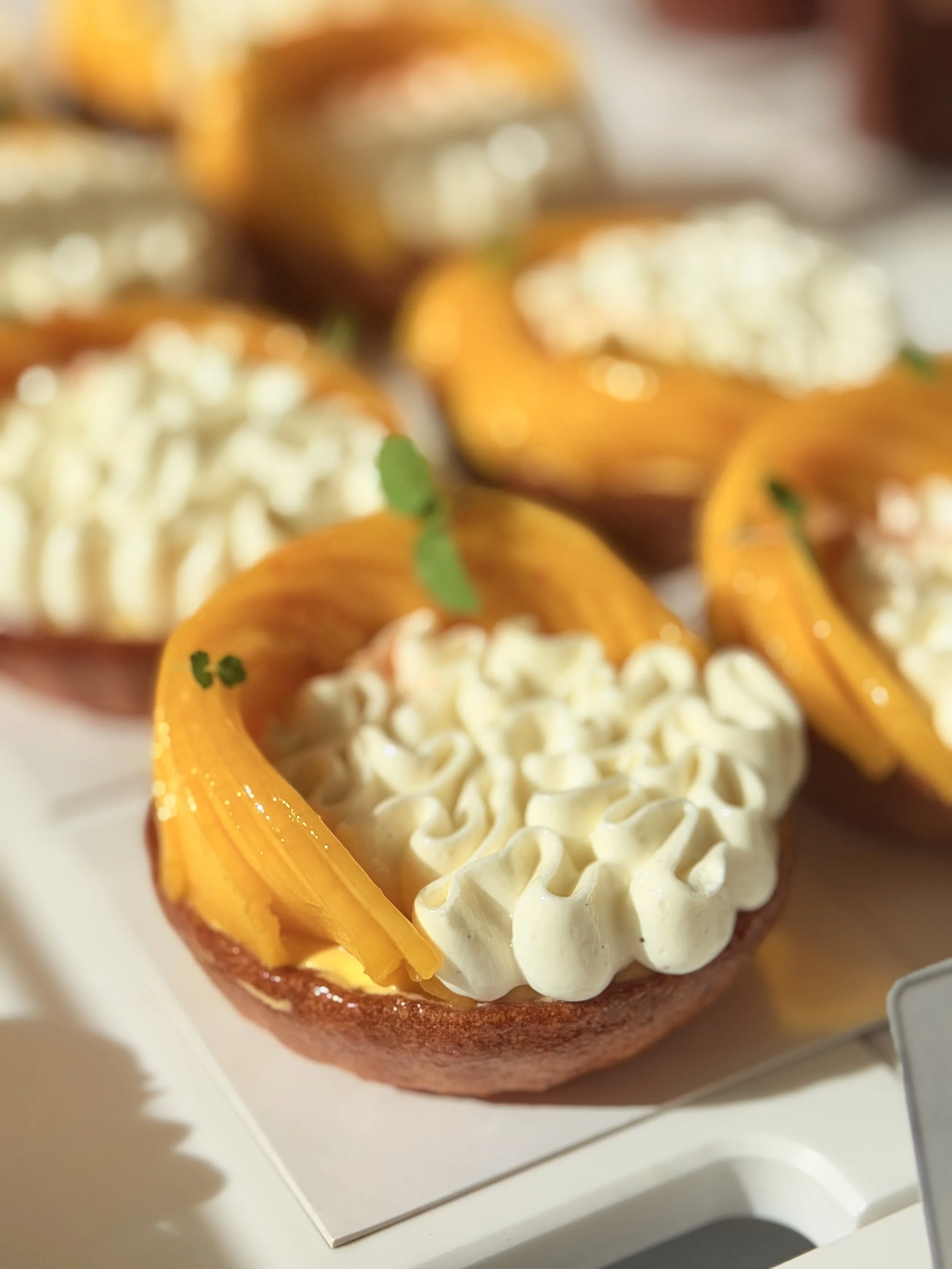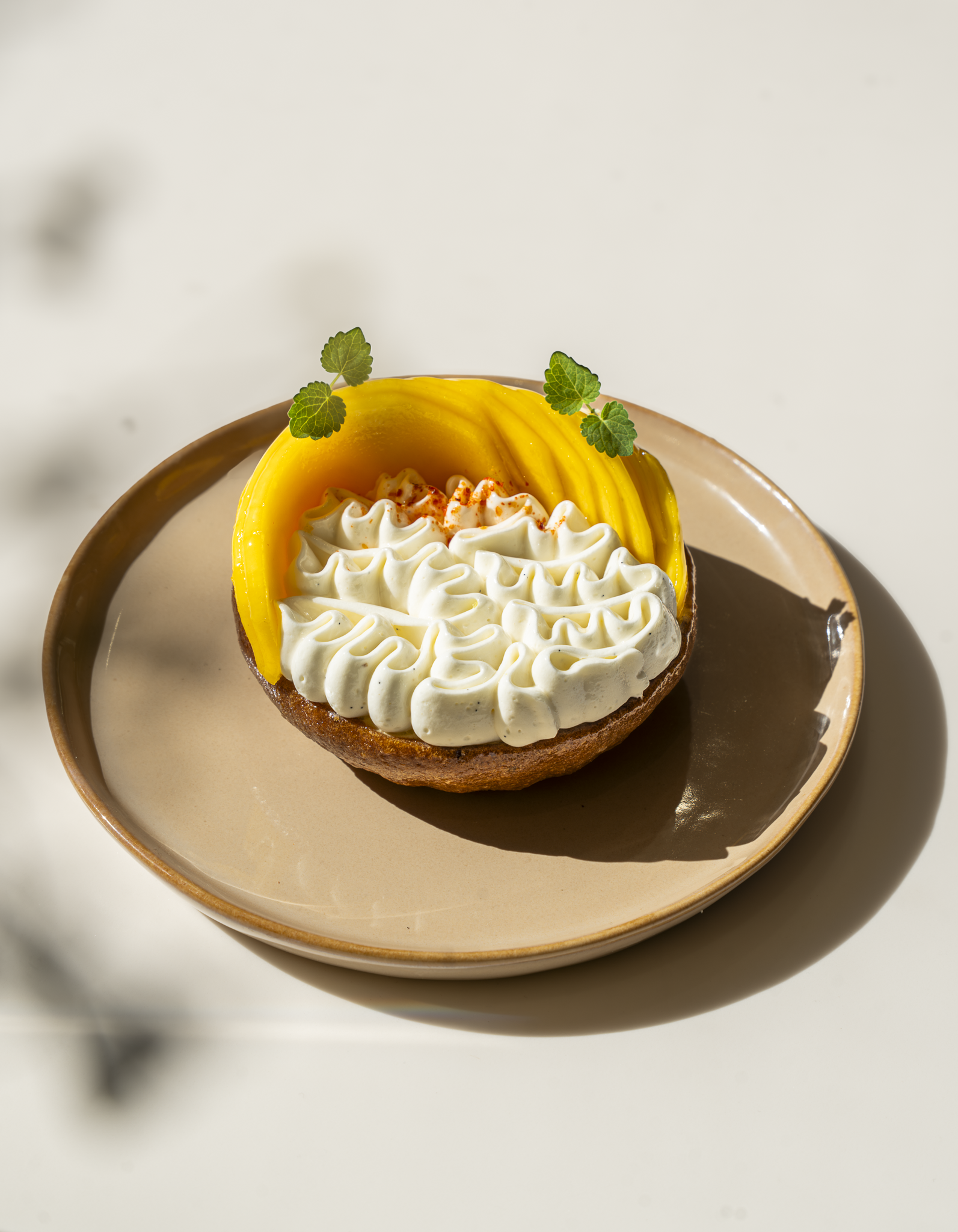 Pâte sucrée, crème d’amande, confit mangue, gel piment oiseau, mousse mangue, mangue fraîche, ganache montée vanille de Madagascar, piment d’espelette aop