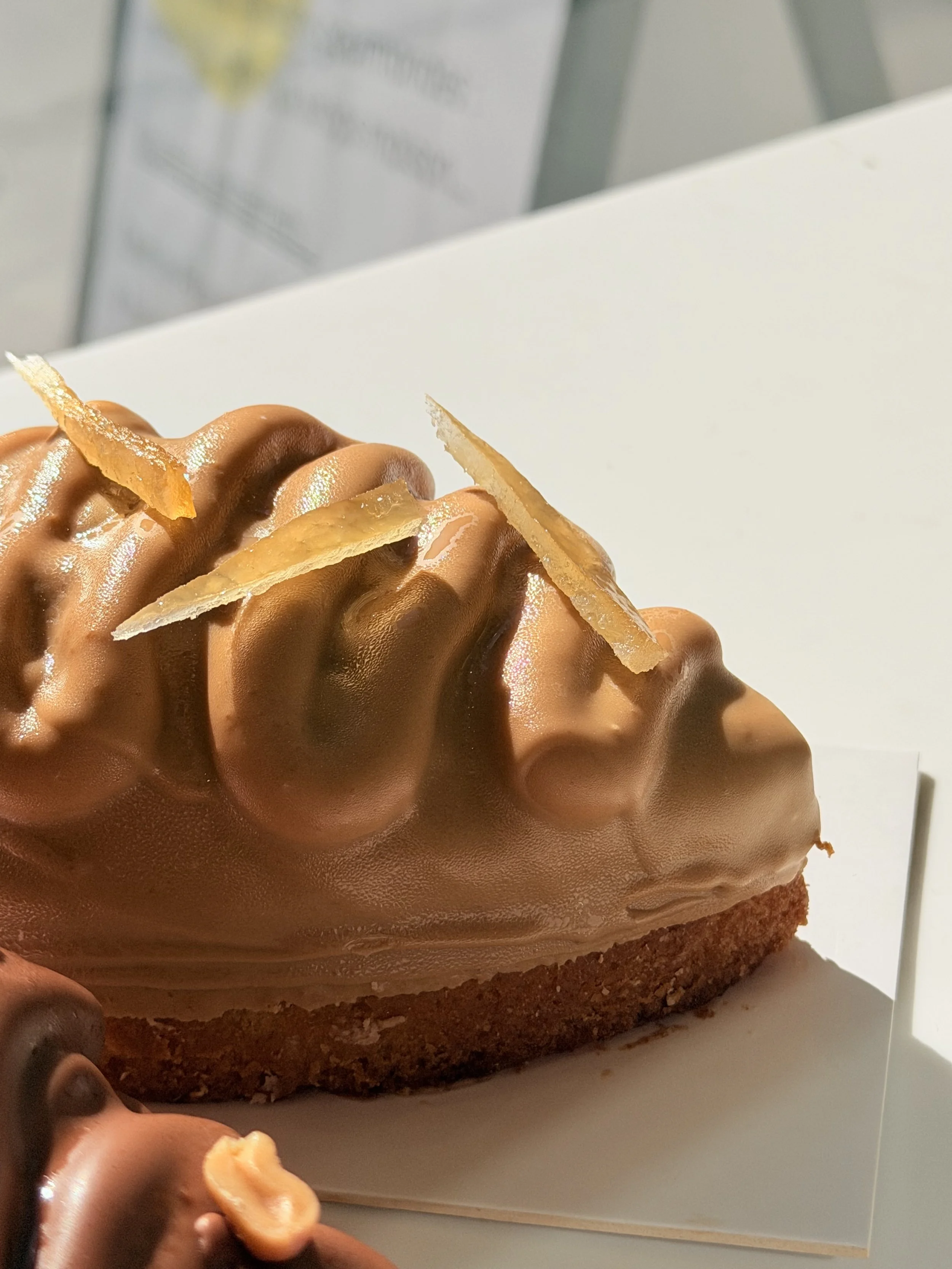cake moelleux bergamote, ganache chocolat blanc bergamote, enrobage chocolat caramélisé, écorces de citron confites