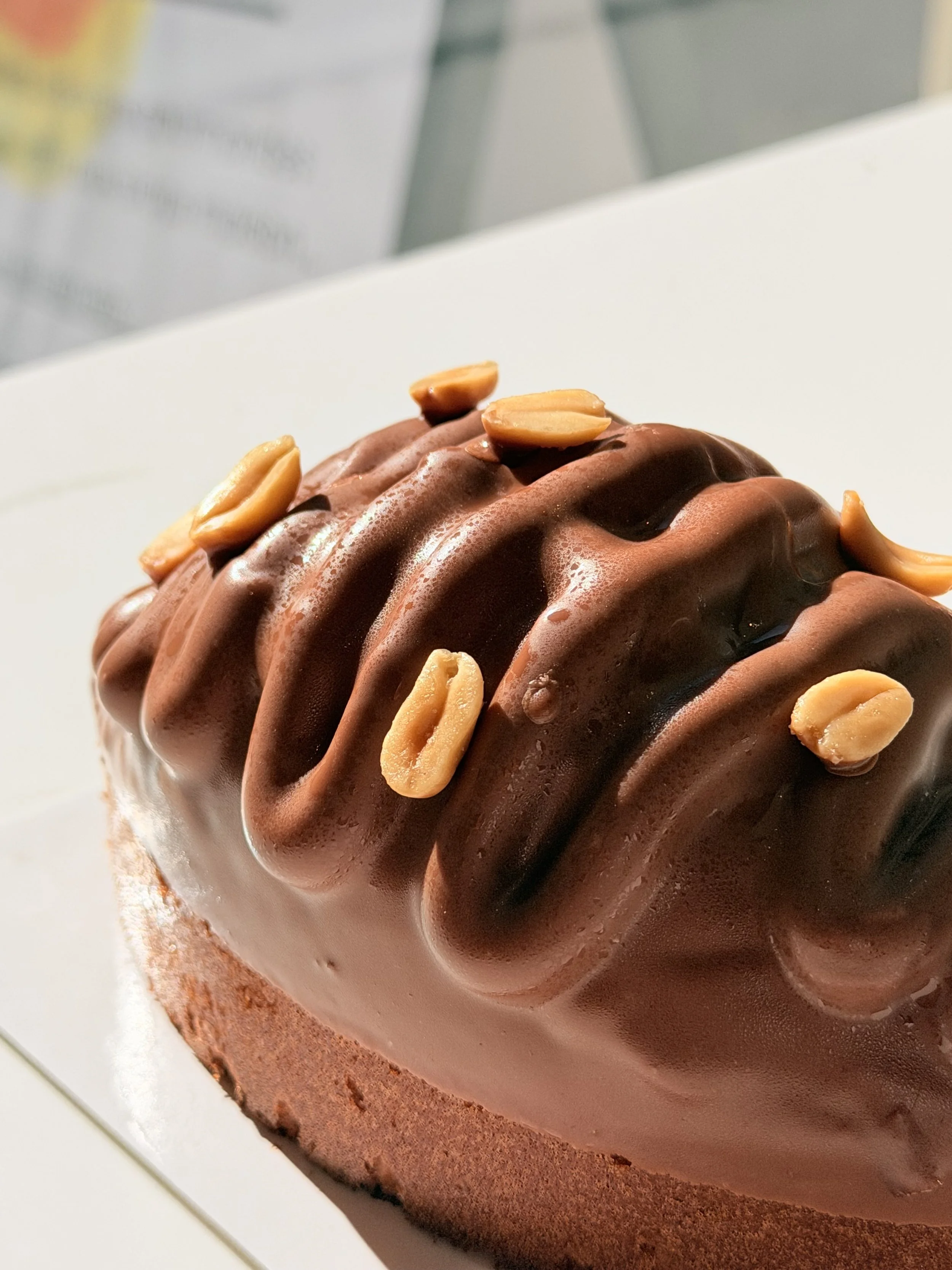 cake moelleux cacahuète, pâte de cacahuète, caramel tendre, enrobage chocolat au lait