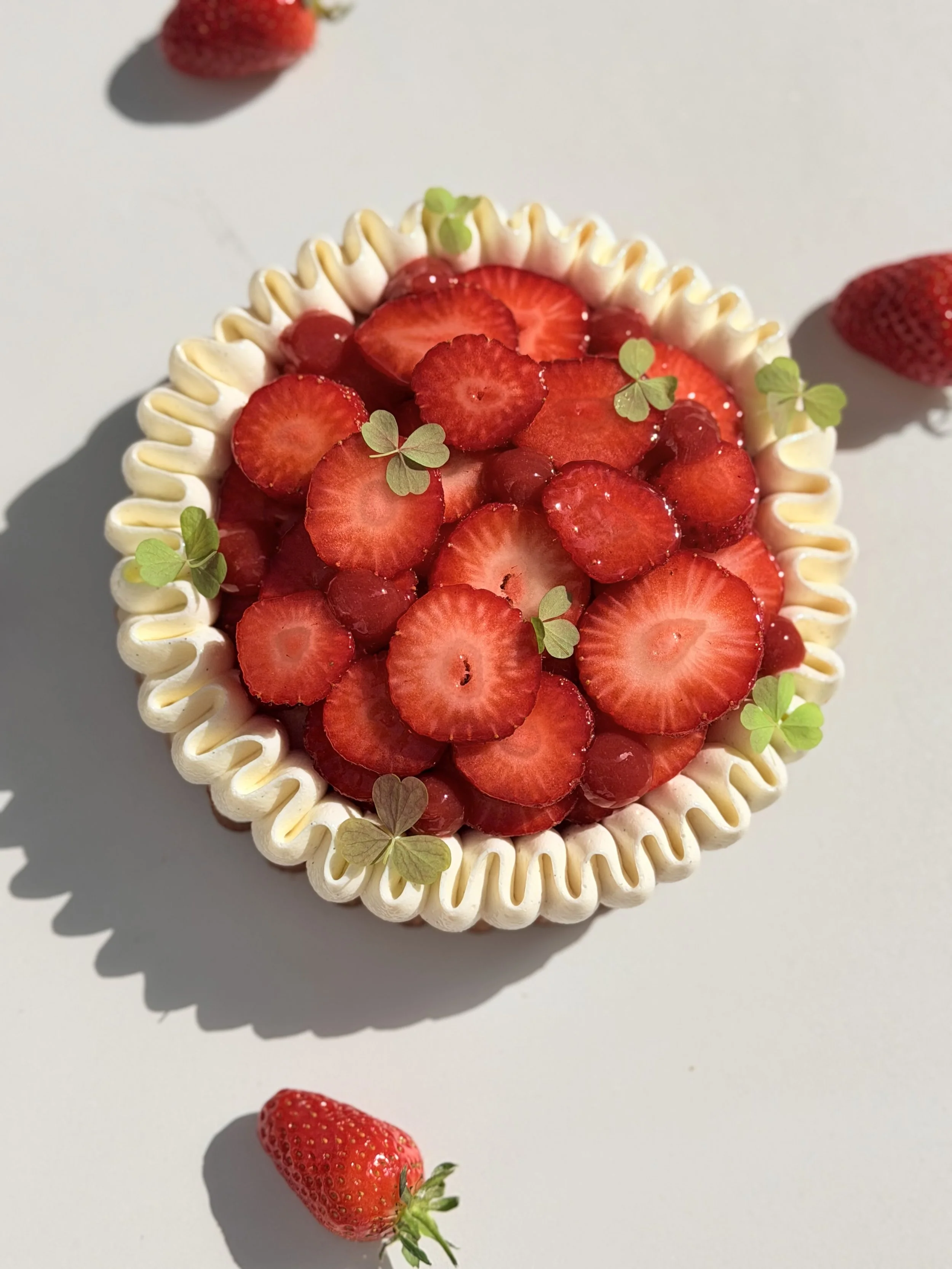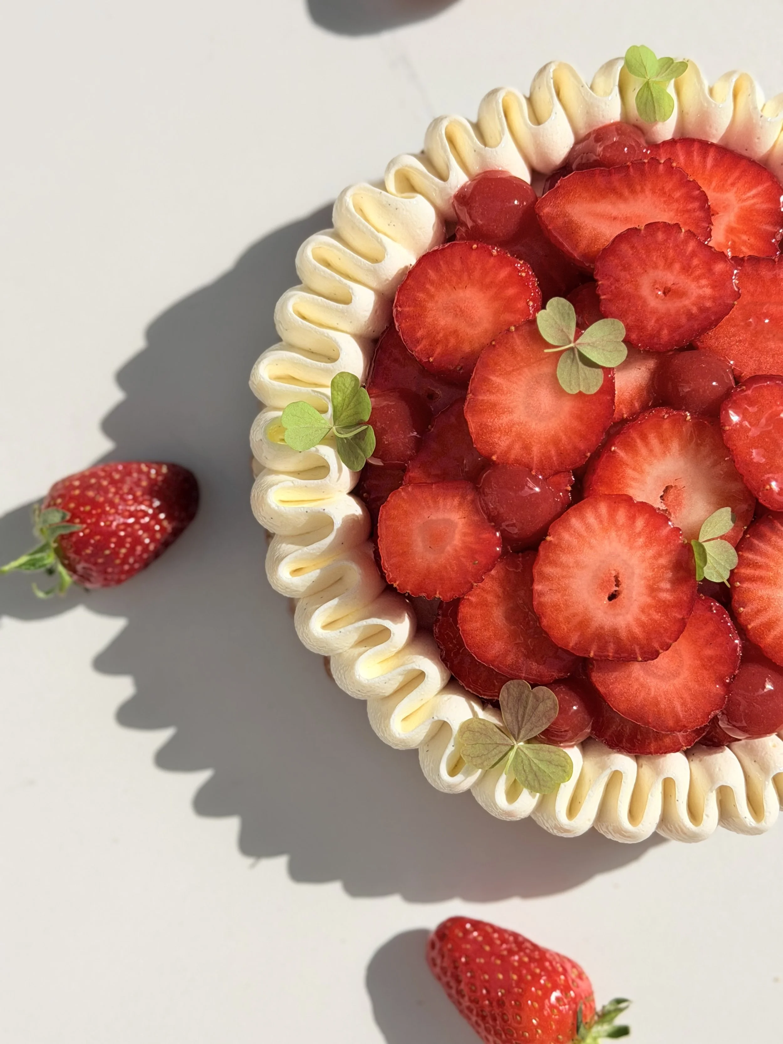 Pâte sucrée, crème d’mande, confit de fraises, mousse au thé jasmin, ganache montée à la vanille de Madagascar, fraises fraîches pleine terre de mauguio